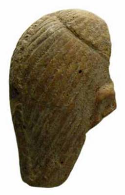 | Description / विवरण | Back view of head of human figure showing combed hair locks drawn back side of the head and its end made into a knot. An ornament Perveni having leafy chevouran design with mid rib hanged from the mid portion to back side. The lower portion missing. Right ear slightly seen. |