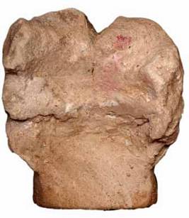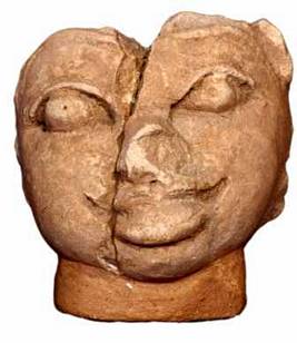 | Description / विवरण | Broken head of a human figure available in two pieces, mended . Round face, nose broken, wide open mouth, thick lips, diamond shaped eyes with prominent bulged eye balls, head and ears damaged. |