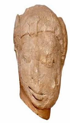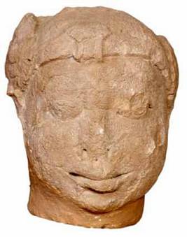 | Description / विवरण | A worn out head of male with hair tied in a band, a buckle like jewel at the centre of the band. He is shown with oval face with long and pointed nose broken , thick lips, almond shaped eyes, half closed eyes , fleshy cheeks. |
