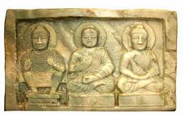 | Description / विवरण | Dhyani Buddhas seated on a pedestal in three aspects. Proceeding from left to right, the first one depicts Buddha in meditation. His head has hallo all around. Eyes are closed. His right hand is in abhayamudra while the left hand is pointed inwards. The second one is also seated cross legged. padmasana . His right hand is in chinmudra, whereas the left hand rests on the lap, palm closed. There is a hallo around the head. At the bottom, on the pedestal is the i. The third one is similar to the previous one. Both the hands are shown joining each other, facing upwards. All the three figures have ushnisha. Imitation of Amaravati School of Art. |