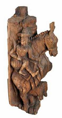 | Description / विवरण | Gaja Kesari motif is decorative art piece of temple chariot. Its shows a man over a caparisoned horse holding the reins of horse with his right hand while his left hand kept on the sword, riding over the lion kesari . He wears a turban and other facial features are abraded. The lion is shown seated on its raised legs and the fore legs are raised as if it is carrying the horse. It is shown as tired animal with wide open mouth and long protruding tongue exposing teeth, bulged projected round eye balls, raised ear lobes. Probably another rein is connected to the neck of the horse and the neck of the lion inorder to control the animals. He wears a conical tiered turban, kundalas, armlets and wristlets. Here the lion, kept its head down, rested its forelegs on pedestal. The bracket figure is carved in a niche with pilaster motifs on either front side one is broken . The rider wears a flat hat with conical top. He shows prominent moustache, long nose, thin lips, oval face. He wears kundalas. His two legs are shown on one side as if he is getting down from the animal. The face of lion is broken. |