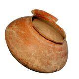 | Description / विवरण | A redware pot with round base, slightly carinated waist, concave body, constricted neck with splayed out externally thick flat rim. Of medium fabric it is treated with fine slip. Half of the rim broken. |