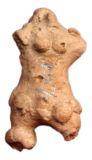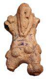 | Description / विवरण | Archaic terracotta figure of mother goddess having coiled hair bands falling on her face and on the shoulders and back, breasts are shown prominently. Short and stout legs with bulged foot the other side is broken . Her back hair locks are shown as long threads. She is decked in simple under garment. Probably, she wears a garland of male heads as waist band. No clear representation of facial features. Hands are broken. |