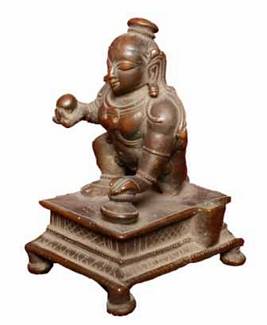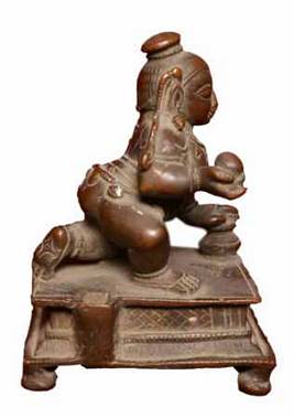 | Description / विवरण | Bronze icon of crawling Balakrishna on a stepped legged ornamental pita. He is show with raised right hand holding a ball of butter, whereas his left hand placed of the pot. The combed hair made into a bun with a top knot. He is shown in simple ornamentation such as wristlets, armlets, necklaces, kundalas, yajnopavita, waist band etc., There are two cylindrical posts having holes luted on either side of the pitha, probably for fixing an ornamental prabhavali. |