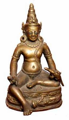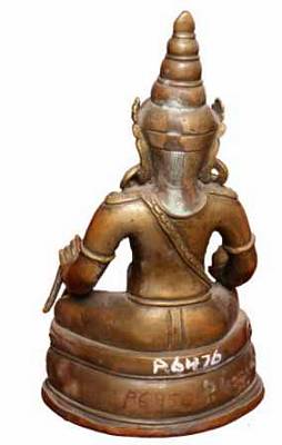 | Description / विवरण | A bronze icon of Kubera seated on a decorated semi-circular pitha with a fallen flower pot on the front side. He is seated on a circular pitha in adhaparyankasana. He holds a mongoose in his left hand and rested on his left thigh whereas in right kept on thigh and open palm with six fingers. The fingers are folded inside and the rest are open. He wears three tiered karnadamakuta topped by flower bud. Upraised tassels are shown prominently on either side of the head. He wears beaded kantahara, circular big kundalas followed by small ones rested on the shoulders, bhujakiritis, yajonopavita, ardhoruka with waist band, wristlets. He is shown with slightly projected belly with prominent nave. Nipples are demarcated by circles, combed hair locks are rested on the back. |