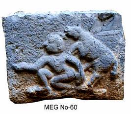 | Description / विवरण | This is an erotic sculpture of male seated facing left, with a boar standing on its hind legs, while the fore legs are raised and resting on the back of the male. The man s right leg is bent and drawn inward, while the left leg is raised upward. The left hand is extended towards left while the right hand touches his foot on the rear. It is a scene of intercourse wherein man is shown enjoying with an animal. |