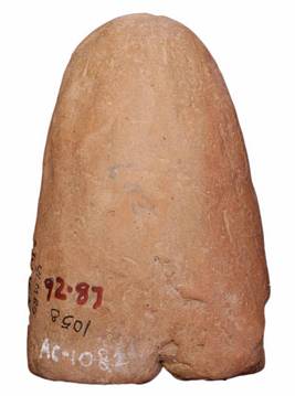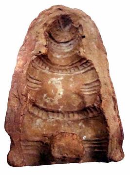 | Description / विवरण | A terracotta mould depicted with back view of human figurine. Richly decorated with kantahara, armlets, anklets, beaded waist. |