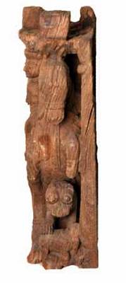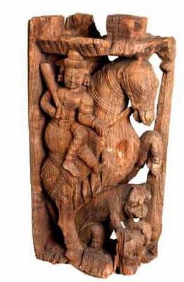 | Description / विवरण | Gaja Kesari motif is decorative art piece of temple chariot. showing a man over a caparisoned horse holding the reins of horse with his right hand, while his left hand kept on the sword, riding over the lion kesari . He wears a turban and facial features are abraded. The lion is shown seated on its raised legs and the fore legs are raised as if it is carrying the horse. It is shown as tired animal with wide open mouth and long protruding tongue exposing teeth, bulged projected round eye balls, raised ear lobes. Probably another rein is connected to the neck of the horse and the neck of the lion inorder to control the animals. He wears conical tiered turban, kundalas, armlets and wristlets. Here the lion, kept its head down, rested its forelegs on pedestal. The bracket figure is carved in a niche with pilaster motifs on either front side one is broken . |