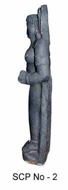 | Description / विवरण | A woman partially nude standing in dwibhanga posture. Her hair is braided and matted in to a broad lump like bun on the back side, while the fore part is tied by a broad head-band, decorated with festoons. The ears are ornamented with chakra kundalas. Around the neck are two tight necklaces and a long garland like hara, falling on the abdomen passing through the breasts. The shoulders are decorated with bhuja kirtis and the biceps with keyuras comprising broad pendents and a broad arch like kirti mukha motif with a round object in the centre. The woman carries in her palms an indeterminate object in her right palm, whereas there is a custard apple in the left. There is scanty drapery for the woman. The legs and feet are decorated with anklets and manjiras. On the whole, the image looks roundish and stout. Seems to belong to the Kakatiya School of Art. |