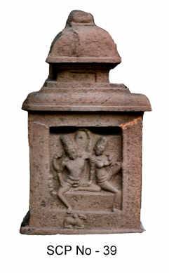 | Description / विवरण | A miniature temple model with a niche depicting Siva as Uma sahita Alingana Chandrasekhara murti. This shows the god Siva and his consort Uma seated on the same pitha pedestal . Here Siva is seated in maharaja lila aspect with the right leg hanging free and the foot resting on the pitha, where as the left leg is bent inward. He wears a kirita makuta, which is tall with a conical top. Head is inclined rightwards. He has four hands. The right rear hand is bent and held high up in to the air, while the left hand placed on the shoulder of his consort and touches the breast. He wears a tight necklace and katibandha. He wears a loin cloth with a girdle. To his left is the consort Uma seated by the side of the lap of the god Siva. Her face is turned rightward, while the torso faces left. She also wears a jata makuta. Her right leg hangs down freely while the left leg is lifted up and kept on the pedestal. She has two arms the right resting on the lap of the lord Siva, while the left one is kept on the knee. Like Siva, she also wears a lone necklace. Both the images are slim in proportion with meager ornamentation. |