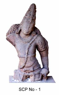 | Description / विवरण | Broken torso of Saivate dwarapala. Head is decorated with prominent jata makuta, studded with precious stones, crescentic moon and serpent on the front side of the jata. The crown is conical shape in receding tiers. Face is slightly inclined towards left. Hair on the rear falls on both the shoulders. Ears are decorated with makara and patra kundalas. Around the neck and on the chest there are two tight necklaces kanta malas , There is a long thick beaded yajnopavita mukta Yajnopavita across the left shoulder. The right hand is broken. The left arm is decorated with ornaments like bahu valayas, armlets with lion motif and a wristlet.A waist band udara bandha is also seen. The lower part of the image is missing. The waist portion is decorated with a girdle mekhala and a short lower garment around the loin ardhoruka . The left hand is kept on the upper part of the gada broken . The fore head is broad, while the face has thick lips and fleshy cheeks. On the whole, the image presents a bulbous look rather stout. It shows the features of the Rastrakuta School of Art. |