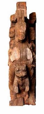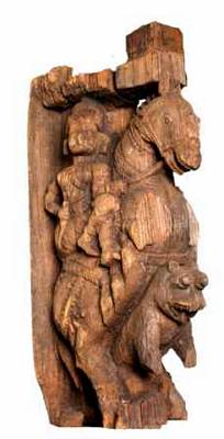 | Description / विवरण | Gaja Kesari motif is decorative art piece of temple chariot. Its shows a man over a caparisoned horse holding the reins of horse with his right hand while his left hand kept on the sword, riding over the lion kesari . He wears a turban and facial are abraded. The lion is shown seated on its raised legs and the fore legs are raised as a if it is carrying the horse. It is shown as tired animal with wide open mouth and long protruding tongue and exposing teeth, bulged projected round eye balls, raised ear lobes. Probably another rein is connected to the neck of the horse and the neck of the lion, in order to control the animals. |