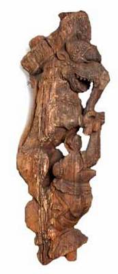 | Description / विवरण | Gaja Kesari motif is decorative art piece of temple chariot. A lion riding over an elephant, placing its hind legs on back portion of the elephant, whereas the elephant stands on its hind legs and the front folded legs raised. It has tusks. It wears a garland of bells around its neck. Left leg placed on the temple portion of the elephant head, and holds the trunk of the elephant with its right leg. Interestingly another rope like thing is shown connecting the trunk of the elephant and nasal part of the lion as if it is riding the elephant. The lion is shown with wide open mouth, bulged eyes, projected eye balls, prominent hair locks on the neck part and also on mane portion. |