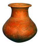 | Description / विवरण | A red ware pot with round base and convex body with slightly carinated waist. Sloppy shoulders with high long neck and splayed out externally thickened flat rim. Three prominent grooves at base of the neck. Of medium fabric, it is treated with fine slip. |