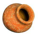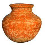 | Description / विवरण | A redware pot having round base, globular body with convex neck, slightly splayed out externally thickened rim. A pair of prominent grooves on the shoulder and the neck faintly seen . |