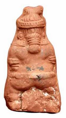 | Description / विवरण | A seated figurine of Mother goddess on a pedestal with closed hands placed on either side of the nave, prominent eyes, flattened nose, wears tight necklace, a heavy jeweled hara, patra kundalas, with simple head gear. Hair tied into makarika ornament, prominent mekhala. It shows combed hair on the back side, and tied with a band. Wears keyuras, wrist band. |