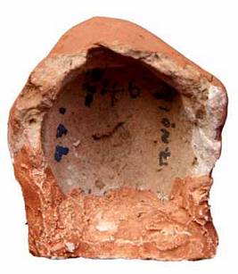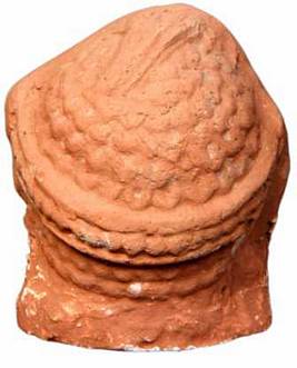 | Description / विवरण | Back view of human head with decorated turban or skull cap. Turban is decorated with many wavy lines probably beaded designs. Made in double mould. |