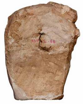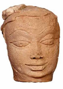 | Description / विवरण | Head of a human figure with sharp, short nose, smiling face, broad eyes thick eye brows neatly combed hair with a flower on one side of the fore head is seen prominently. |