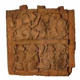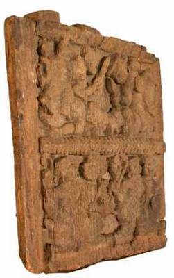 | Description / विवरण | Wooden panel has two horizontal registers, separated by leafy or rope design. It is a narrative panel depicts two scenes in each register. In the first lower register, on the left is a fight scene between a Vanara who holds a gada in his right hand and a demon. Both are opposite to each other. In the second scene, the demon keeps his right hand on the head of Vanara. In the upper register, on the left side is shown Vanara fallen on the ground, over him the demon tries to kill him with the sword holding in his right hand. In the right scene the demon is on the ground and the Vanara is shown over the demon killing the demon by way of pressing his throat. |