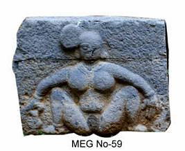 | Description / विवरण | Image of a Lajja gauri, squatting with legs wide apart showing her private parts i.e. Vajina. The hands are extended on either side and turned downwards. She wears a short three stranded tight hara sound the neck. The head is round and the hair is done tightly in the shape of a thick bun on the hind side. |