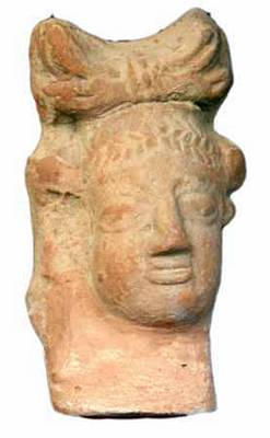 | Description / विवरण | A terracotta head of a human figurine with hair tied in makarika ornament, a leaf designed ornament is seen on the fore head connected to beaded circular jewel on the sides. Elongated pointed nose, almond shaped eyes with slightly protruding eye balls, oval face and thick lower lip, suggests that it is a figure royal personage. |