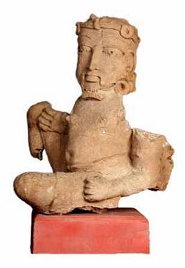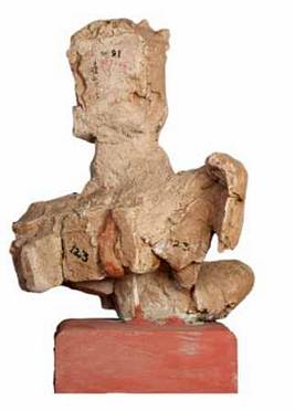 | Description / विवरण | A seated male figurine with head turned to his left side, wears head band decorated with circular designed pendants. He wears circular patra kundalas. He has a prominent mustache, and a French type of beard long pointed , elongated nose, thick lower lip, upper part of the hand is broken, Left hand upper and fingers of the right hand are seen. He placed his right hand with projected fingers on his thigh and his left hand with fingers straight on his left thigh. |