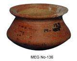 | Description / विवरण | Miniature red ware pot with round base and carinated waist, sloppy shoulders, convex neck with splayed out externally thickened cut flat rim. Multiple grooves below the rim. |