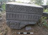 | Description / विवरण | Fragment of architectural component depicted with three horizontal bands on its front side. The upper band is bearing scroll design, middle band with triangular design and lower band is decorated with one big kirttimukha motif. The lower left side of the third band is mutilated |