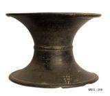 | Description / विवरण | Polished black ware stand with broad thick bottom and deep groove. Convex body splayed out externally thick grooved rim. A beautifully delicately delineated rope design at the middle. |