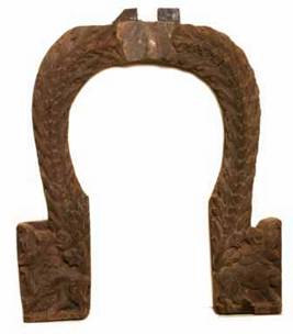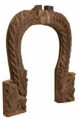 | Description / विवरण | Kirti Torana made on two pieces joined together. Each one, at its base is a roaring rampant lion facing outside, from its back is shown a garland going upside in a arch type fashion. Central Kritimukha is broken. |