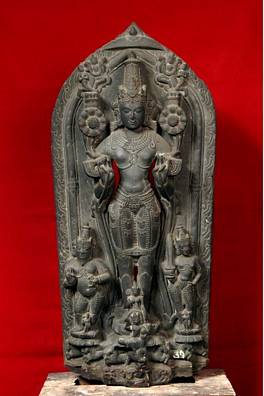 | Description / विवरण | A heavily ornamented Surya holding his lotuses. He is accompanied by Danda and Pingala on his left and right sides. Aruna, the charioteer is seen below with the seven horses. |