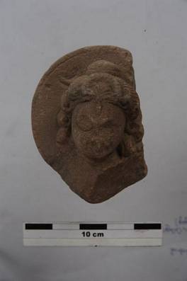 | Description / विवरण | Upper side fragment of a Siva head. The hair are arranged in curls on both the sides of faces. Third eye is present on forehead. A crescent is visible on the halo. Face in weather worn. |