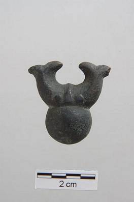 | Description / विवरण | stylised representation of two fishes joined together in their head. Rest of the tail makes a semi circular shape. There is thick round lump of metal just below the joint of fish figure. |