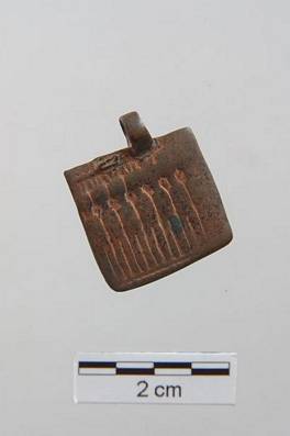 | Description / विवरण | Square shape copper object with round holder on top. There is line drawing of human figures all over the body. |