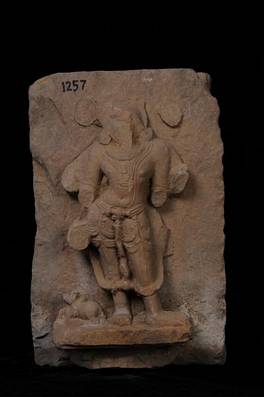| Description / विवरण | Architectural stone showing four armed statue of god Siva,standing in tribhanga pose on a platform. He puts on profuse jewellery and Urujalaka. Head and all his four hands are broken off. Nandi is shown crouching near his feet towards right. |