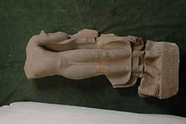 | Description / विवरण | Standing Buddha.The head is missing,and the right hand broken off. The Buddha is shown standing, the weight of the body on the right leg. In proportion the legs are longer than the torso. He wears an antaravasaka and a samghati, one end of which is held in the left hand which is raised almost to the level of the shoulder. This posture is rather unusual in Buddha images from Sarnath where the hand is generally lowered, but is reminiscent instead of Amaravati and Ajanta and also later Pala sculpture of the 8th-9th century from Nalanda. The samghati also flares out at the side of the left leg in a peculiar manner clinging closely to the thighs almost up to the knees. The legs of a kneeling devotee are visible near the Buddha s feet |