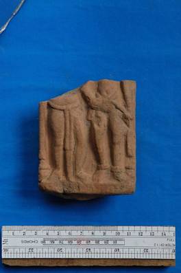 | Description / विवरण | Terracotta plaque preserving the lower part of a couple. One figure holds the scarf tied to its waist. |