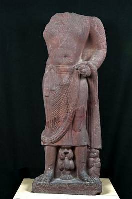 | Description / विवरण | The head and right arm are missing. The left arm is held akimbo, the clenched fist resting against the upper hip. The figure stands in samabhanga posture, the legs placed apart. Between the legs is a bouquet consisting of five lotus buds and one full-blown lotus flower. To the left of the figure, below the samghati folds, are asoka flowers. The Buddha wears a diaphanous antaravasaka reaching below the knees, a samghati covering the left shoulder and arm, and a ribbon like girdle, knotted on the right side, with the loose ends falling over the thigh. The folds are indicated by light incisions and grooved ridges. The fleshy modeling of the torso, the powerful legs spreading outwards below the knees, and the broad, square shoulders are features shared in common with other images of the early phase of the Kusana school of Mathura. On the back are traces of a halo with scalloped edge. This figure is a product of the great workshops at Mathura from where it was exported to Kausambi, its actual find spot. The similarity to the Bala image, also made at Mathura, but found at Sarnath, is striking (cf. ASIAR, 1904-05, Pl. XXVI a-d). The nun Buddhamitra, who dedicated this image, is also associated with the Sarnath image, being mentioned in the long inscription on the stone post which supported the umbrella (Sahni, Catalogue of the Museum of Archaeology at Sarnath, p. 35). The square pedestal bears the following inscription (El XXIV (1937-38), p. 212]. Line 1 [Ma]h[a]rajasya Kan[i]shkasa samva[tsa]r[e]2 h(e) 2 di 8 Bodhisatvo(ttvam) pra[ti]— Line 2 [shtha]payati bhikhuni Buddhamitra trepit[i]ka bhagavato Buddhasa cha[m]kame “In the year 2 of Maharaja Kanishka, on the 8th day of the 2nd (month) of Hemanta, (Buddhist) nun Buddhamitra, who is well-versed in the Tripitaka, sets up (this image of) Bodhisattva at the promenade of the Lord Buddha.†This figure, being dated in the second year of Kanishka, is the earliest dated Buddha image known. A. Ghosh, IHQ X (1934), p. 575 suggests that the date is perhaps to be read as anno 22 and not 2 |