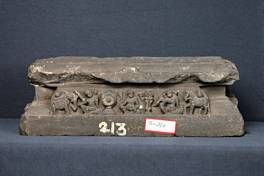 | Description / विवरण | Pedestal of probably a Buddhist image depicting a row of religious symbols. |