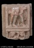 | Description / विवरण | Fragment of an architectural piece, depicting lower part of a couple in a nich and two heads of gana with matted hairs below. The left gana is raised his right hand supporting the load. |