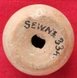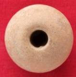 It is a terracotta bead. Oval in shape with a central perforation. The perforation is relatively thick. Striation marks around the neck.