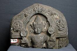 | Description / विवरण | Upper portion of a stele representing Surya. The two lotuses held by Surya are visible. He is flanked by garland bearing figures on both sides. |