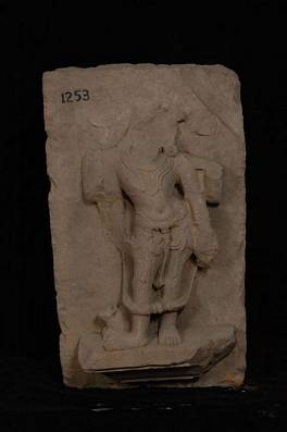 | Description / विवरण | Architectural stone showing statue of four armed and headless Siva standing in tribhanga pose. His head and all the four hands are broken off. He puts on usual dress and ornaments. Nandi is shown crouching near his feet towards right. |