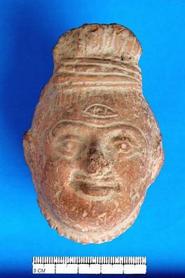 | Description / विवरण | Terracotta head of Siva preserving a third eye on the forehead. Hair arranged upward and tied with fillets. A raised border of beads is seen near the neck. Nose injured. |