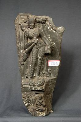 | Description / विवरण | Figure of Lakshmi holding her chauri.Fragment of a stele depicting Visnu with his attendant goddesses Lakshmi and Saraswati. |