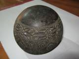 | Description / विवरण | This is a pot made from coconut shell. It is having a good pohish. Carving is done on it with gematrical and floral motifs. Three bands divide the carvings. |