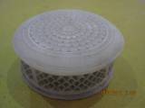 | Description / विवरण | White colour circular basket in marble has a cover. Its top carved as a full blown flower design. Its circular body has lattice design. Narrow grove design also noticed on upper and lower part of lattice work. |