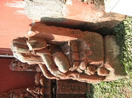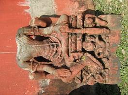 | Description / विवरण | 4 handed image of Visnu is in lalitasana pose. Head is broken and missing. Van mala is visible on the body.Part of jata is visible on both shoulders. Visnu is sitting on a double petalled lotus. Lower right in varada mudara and lower left has a club. |