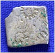 | Description / विवरण | The shape of the coin is pentagonal. This coin has been found from Tarabha, it is assumed that this type of coin was vogue in Kosala Janapada. Obverse Sun, Six armed wheel, Branches of tree and another symbols are indistinct. Reverse One minute symbol. |