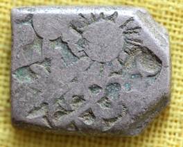 | Description / विवरण | The coin is the imperial type of punch marked coin. It is irregular in shape. Obverse Sun, caduceus, six- armed symbol, triangle. Reverse Minute symbol. |